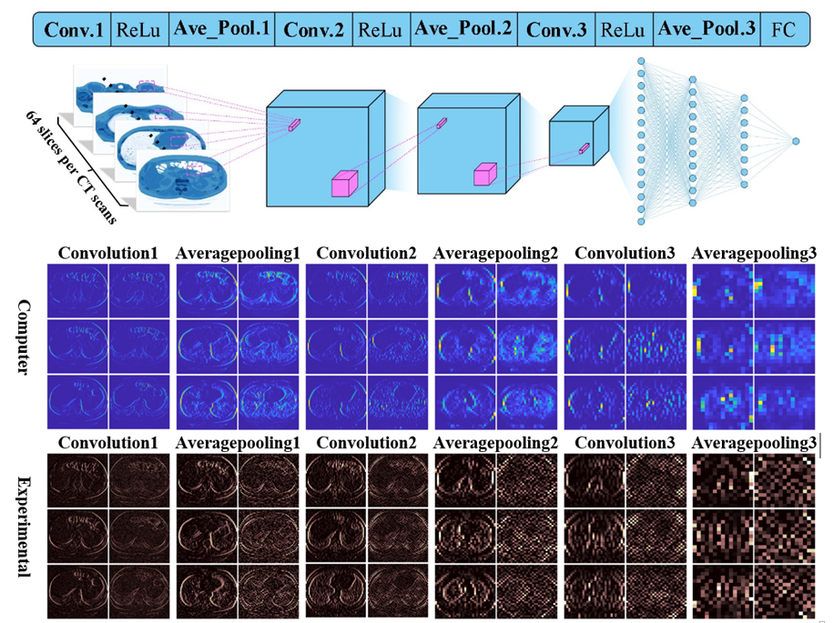 图5. 三维光子卷积神经网络对64通道新冠肺炎CT数据的分类及特征提取结果。
