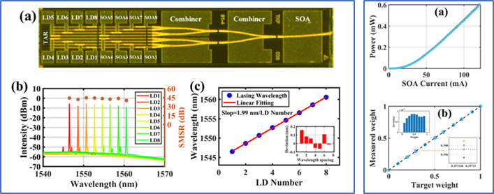 图2. 左栏:单片集成的DFB-SOA,以及激光阵列芯片表征数据;右栏:SOA权重精度表征数据。