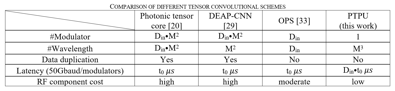 在这项工作中,研究团队提出了光子张量卷积处理器(PTPU),一种更简洁的多通道张量单通道化的光学卷积方案。根据所提出的算法规则,将高阶张量中不同通道的像素混合并重新排列为一维向量。然后,光学波长、空间和时间维度的混合操作使得能够在光学域中直接处理平坦的像素序列。因此,任意高阶张量的所有输入通道合并后只需要一个输入调制器,相关高速器件所占空间比OPS方案小几倍,成本也大幅度降低。
