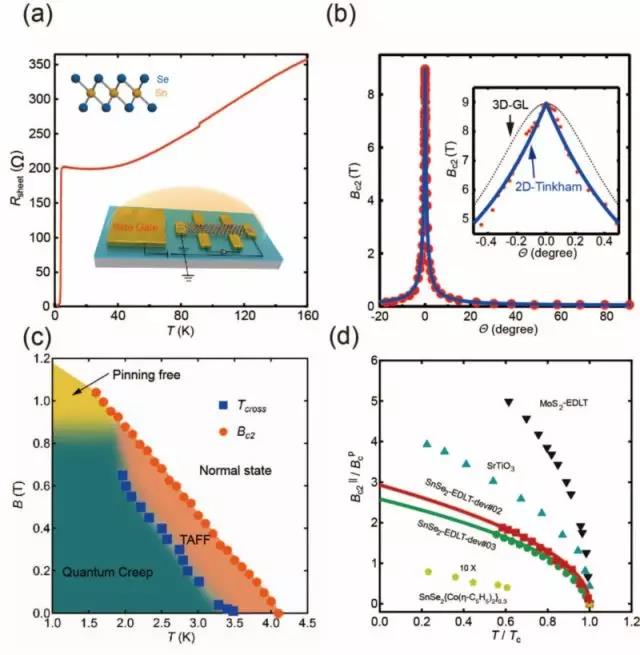 图:(a)二硒化锡超导曲线,上插图为二硒化锡结构图,下图为离子液体门技术示意图;(b)不同角度下的临界磁场,插图为平行磁场附近的数据;(c)不同垂直磁场和温度下的超导相图;(d)平行磁场下不同温度的临界磁场。