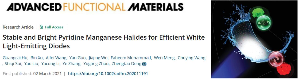 betway88西汉姆联邓正涛教授团队多年来一直致力于新型无机发光材料的基础研究和产业化应用。特别是在白光LED和广色域显示器件方向,针对发光材料在实际应用中的瓶颈问题,在发光材料的性能提升和稳定性方面取得了一系列进展,如:Angew. Chem., Int. Ed.2020, 59, 7738;Mater. Adv. 2021, 2, 1320;Chem. Commun.2021, DOI:10.1039/D0CC08253H;J. Mater. Chem. C2021DIO: 10.1039/D0TC05685E。最近,该课题组采用一种室温快速结晶的方法,制备了具有高光致发光量子效率和高稳定性的无铅锰卤化物钙钛矿材料,并应用于白光LED器件。相关成果于2021年3月2日以“StableandBrightPyridineManganeseHalidesforEfficientWhiteLight-EmittingDiodes”为题在国际知名材料学期刊《AdvancedFunctionalMaterials》杂志(影响因子:16.836)上在线发表。