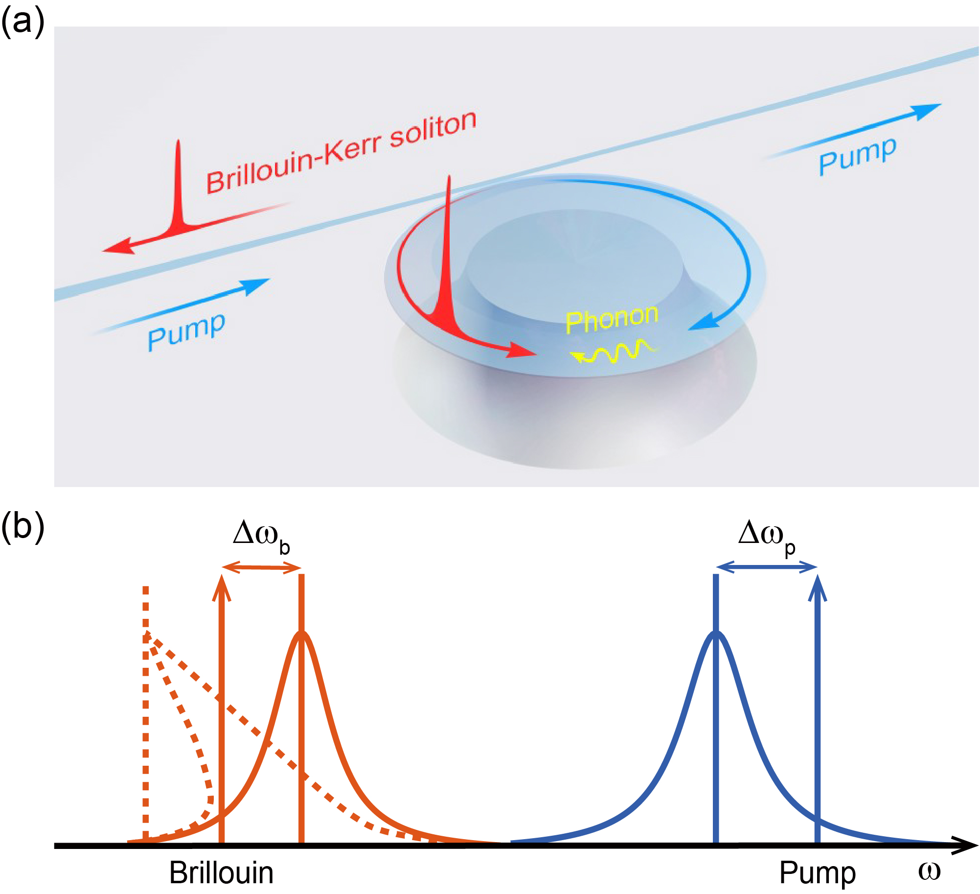 图1。(a)布里渊-克尔孤子光学频率梳示意图。(b)红失谐布里渊激光示意图。