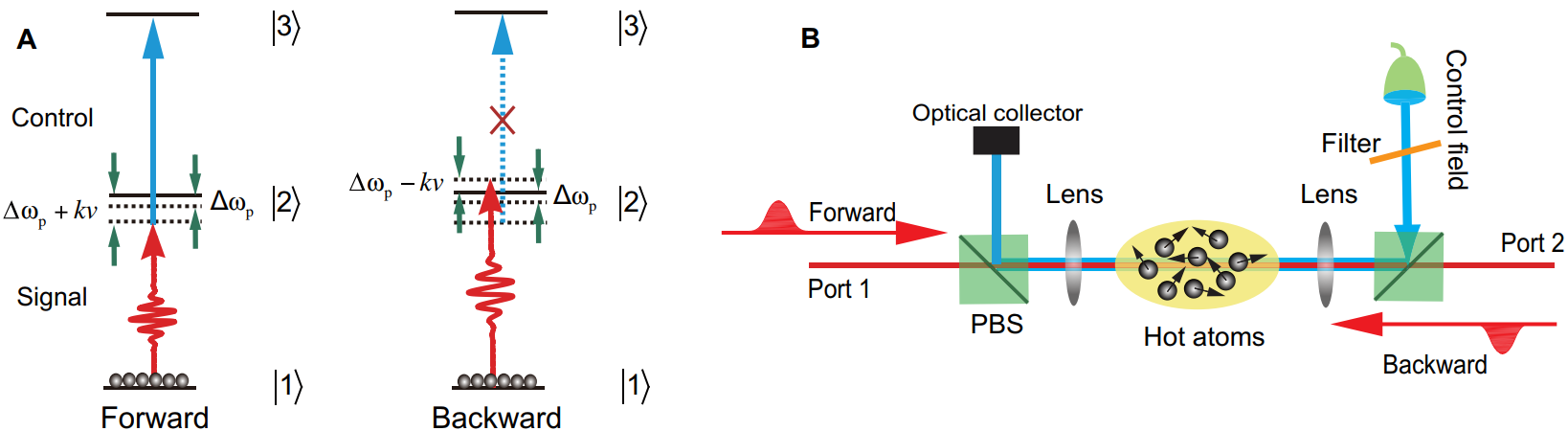 图1. 原子热运动诱导的光学非互易原理示意图和实验装置图