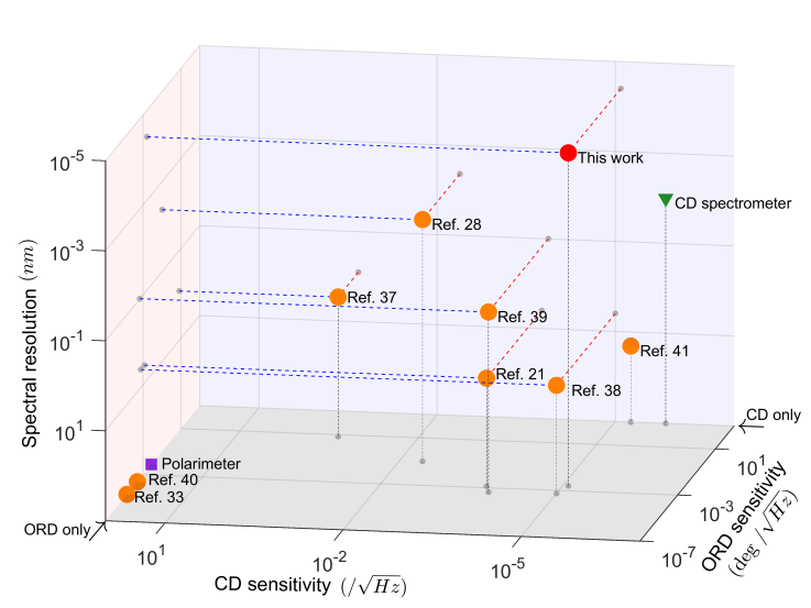 图1. 不同的设计方案下,ORD和CD测量灵敏度与谱分辨率的结果。红色圆圈代表本工作的实验结果。