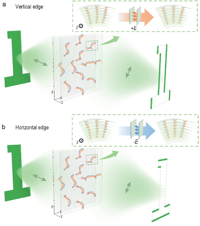 betway88西汉姆联陈鹏、陆延青团队与深圳大学张万隆、袁小聪团队深入合作,提出了一种可快速重构的拓扑手性层状铁电液晶器件,探究了电场驱动下的矢量光场动态变换,实现了正交维度、宽带光学图像边缘的快速选择与切换,为动态实时光学图像处理提供了新技术。构筑等效光轴分布满足α = 0.5φ+α0的铁电液晶器件,该铁电液晶器件对入射线偏振光的空间频谱进行相位调制,正交检偏后近似实现一维空间微分。携带图案信息的输入光场与传递函数的卷积使得图案局域无变化区域发生相消干涉,而边缘区域被强化。事实上,输出边缘方向与α0高度相关,通过选择不同的α0,可以增强沿不同方向的边缘。有趣的是,铁电液晶超结构的整体等效光轴可以通过施加的外部电场进行重构。当外加电场的极性改变时,α0将改变2θ(从-θ/+θ变为+θ/-θ),导致所选择的边缘方向发生同步变化。如图1a所示,在外加电场正极性下,α0=+θ=+π/8,垂直边缘被选择并显著增强;相反,对于负极性(图1b),成像过程中有选择地突出显示了水平边缘。在该方案中,拓扑手性层状液晶超结构在电场控制下发生解旋,不同极性条件下有效光轴分布重构,可以实现两个正交方向边缘像的快速选择与动态切换。