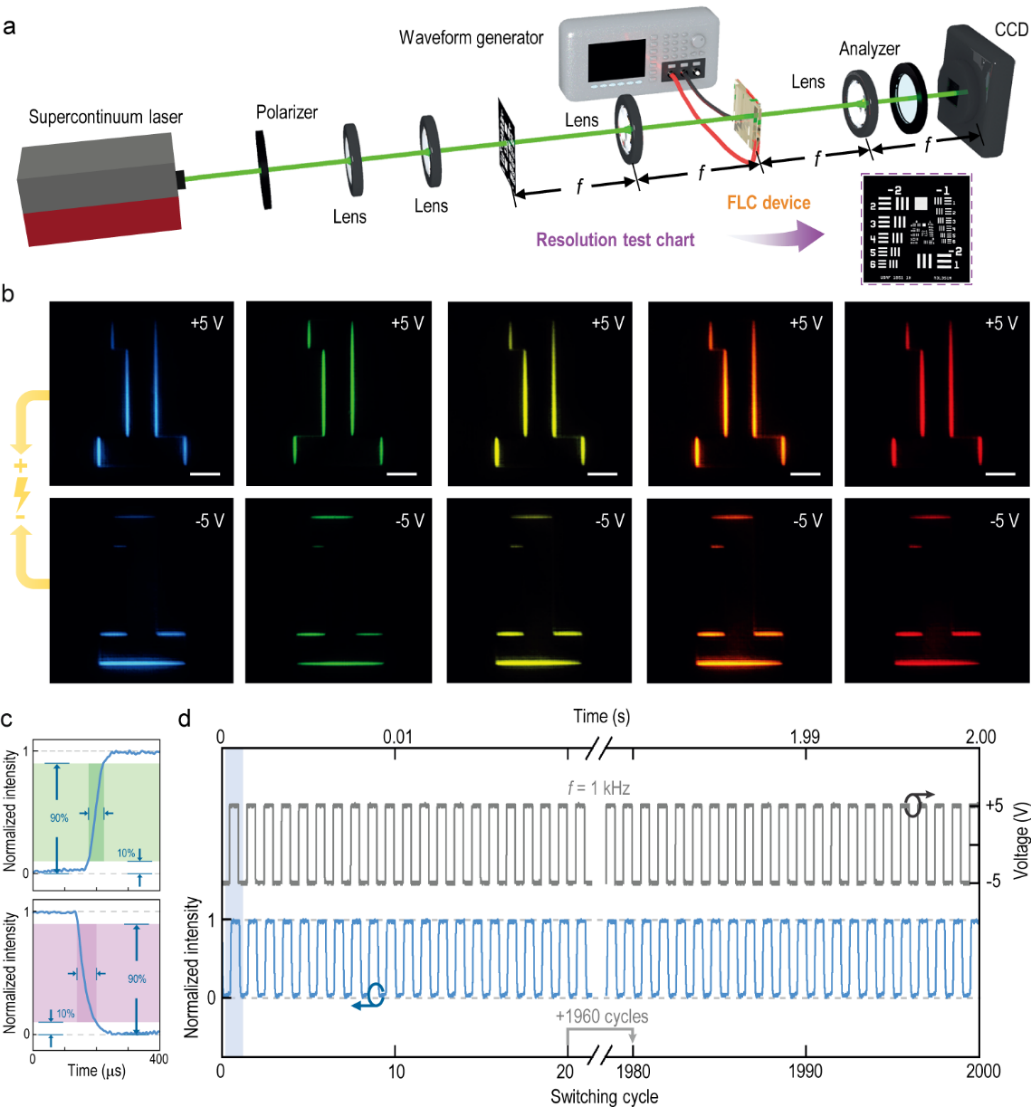 图2. 铁电液晶超结构的制备流程、结构表征及其对矢量光场的动态调控