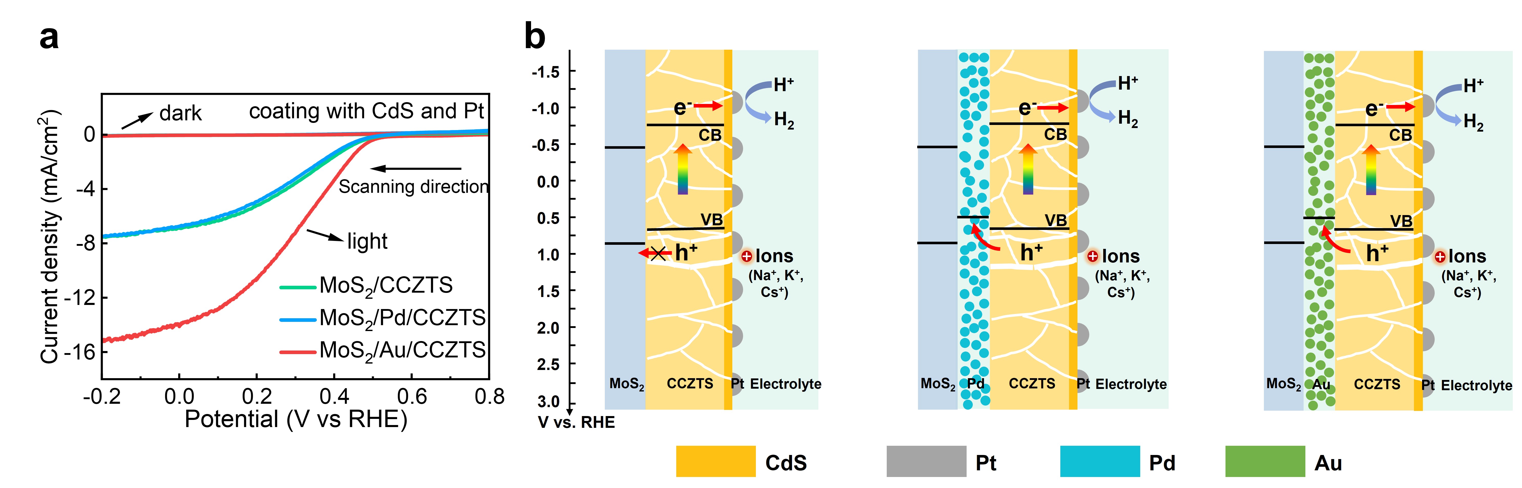 图1. (a) MoS2/CCZTS, MoS2/Pd/CCZTS 和 MoS2/Au/CCZTS异质结光电催化制氢性能,(b)基于传统能带排列理论的异质结界面电荷传输示意图。