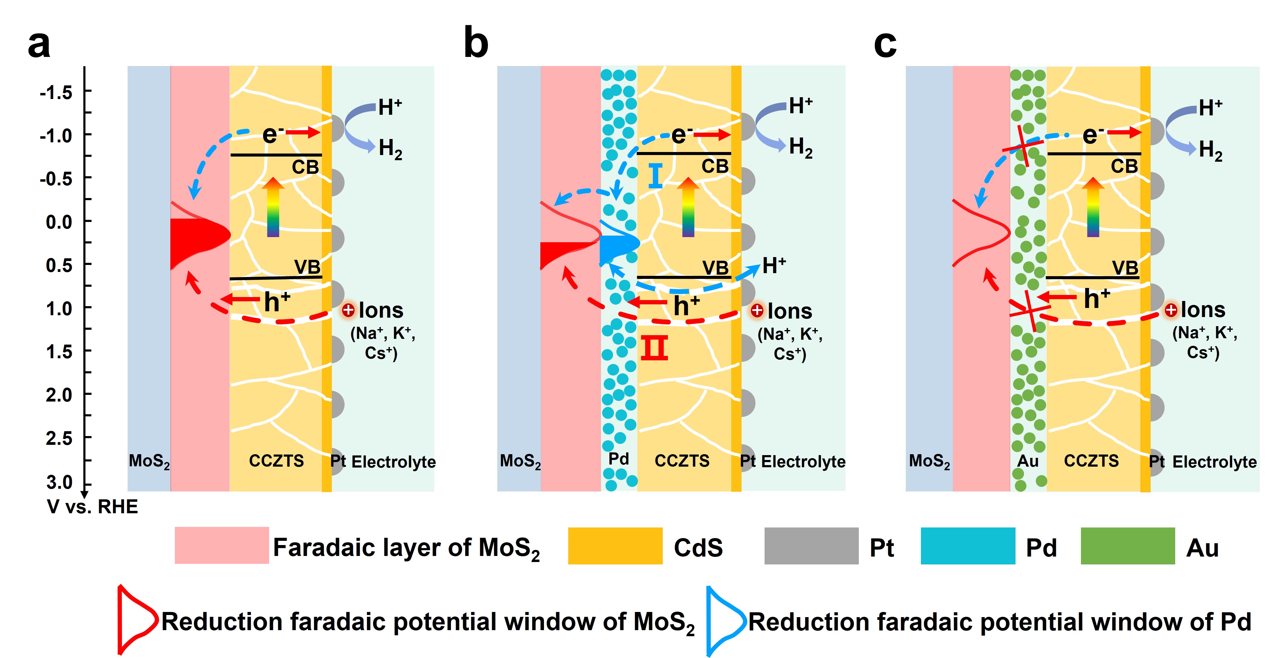 针对这一问题,betway88西汉姆联固体微结构物理国家重点实验室、betway88西汉姆联、物理学院的罗文俊教授/邹志刚院士团队与南京邮电大学辛颢教授课题组合作,以MoS2/Cd-Cu2ZnSnS4 (CCZTS)半导体异质结光电极为研究对象,发现引入Au中间层可以显著提升异质结光电催化分解水性能,在模拟太阳光的照射下光电流高达16.3 mA/cm2@0 VRHE。然而,引入具有相似功函数的Pd中间层却无法提高异质结光电流。因此,采用传统能带排列理论无法解释该实验现象(图1)。为了探究Au和Pd中间层对异质结界面电荷传输的影响规律,该工作通过原位X射线光电子谱、准原位拉曼光谱以及飞行时间-二次离子质谱等表征手段,发现光照下CCZTS中的光生电子注入MoS2,诱导其表面发生还原法拉第反应(MoS2 + x Na+ + x e- ↔ NaxMoS2)。然而,CCZTS中的光生空穴会使还原产物NaxMoS2重新氧化,导致电子空穴复合,降低了MoS2/CCZTS异质结的光电流(图2a)。进一步的电化学测量结果表明Pd中间层还原电位窗口与MoS2接近,使CCZTS中的光生电子可以通过Pd上的法拉第反应(Pd + x H+ + x e− ↔ PdHx)将电子转移到MoS2上,诱导其发生还原反应(图2b)。与Pd中间层不同,Au在相同的电位窗口范围内几乎不发生还原反应,阻碍了MoS2/CCZTS异质结中的电子离子耦合传输,从而抑制了光生电子空穴的复合(图2c)。因此,Au而不是Pd中间层可以提高MoS2/CCZTS光电催化分解水制氢性能。该研究工作表明电位窗口而不是能带位置是调控异质结光电极界面电荷传输方向的主要依据,不仅加深了对光电催化界面电荷转移行为的理解,也为提高其他异质结太阳能转换效率提供了新的设计原则。