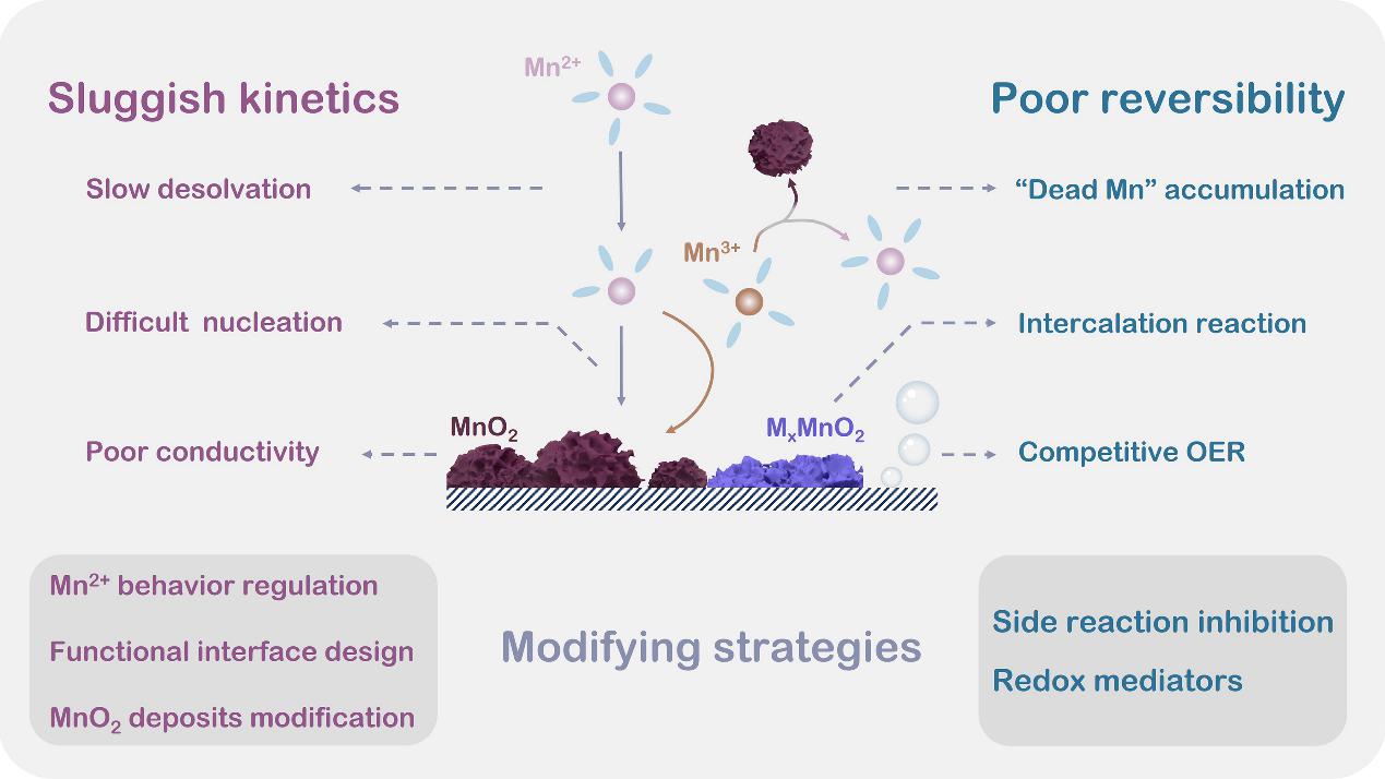 图6. MnO2溶解/沉积反应的主要问题及改性策略示意图。