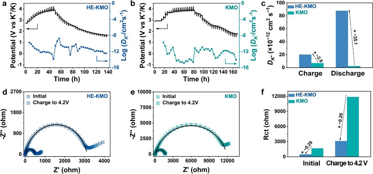图2. 充放电过程中,H-KMO和KMO的动力学特性。首圈充放电过程中,(a)HE-KMO和(b)KMO电极的K+扩散系数(DK+)和相应的GITT曲线。(c)HE-KMO和KMO在充电和放电过程中的平均K+扩散系数。(d)HE-KMO和(e)KMO电极在原始状态(OCV)、充电状态(Ch-4.2V)下的EIS曲线。(f)HE-KMO和KMO的拟合Rct。