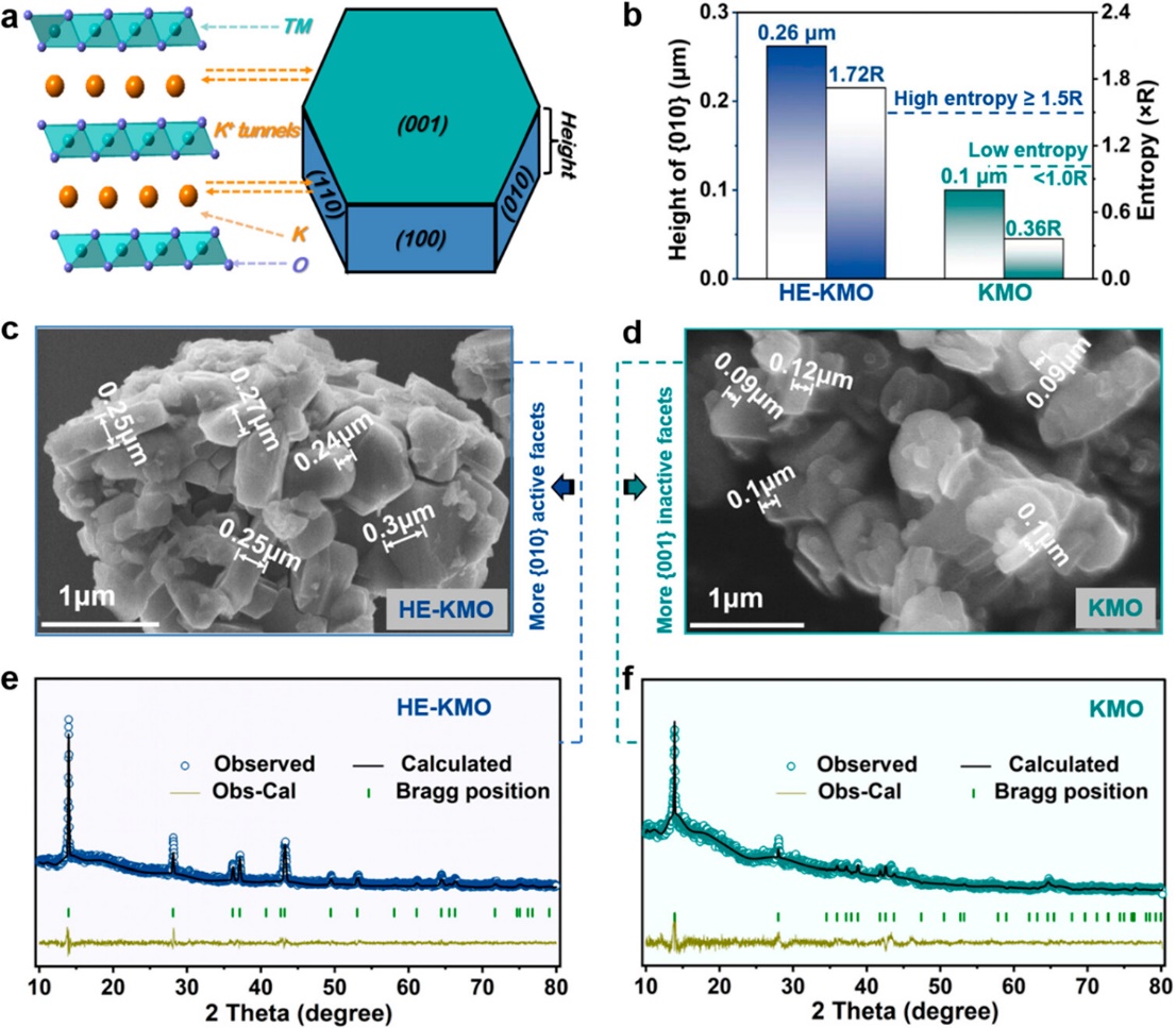 图1. HE-KMO和KMO的微观结构表征。(a)具有六个{010}面和两个{001}面的层状KxTMO2形态结构示意图。(b)HE-KMO和KMO样品的{010}面高度和构型熵。(c)HE-KMO和(d) KMO样品的SEM图像。(e)HE-KMO和(f)KMO的XRD图案和相应的Rietveld精修。