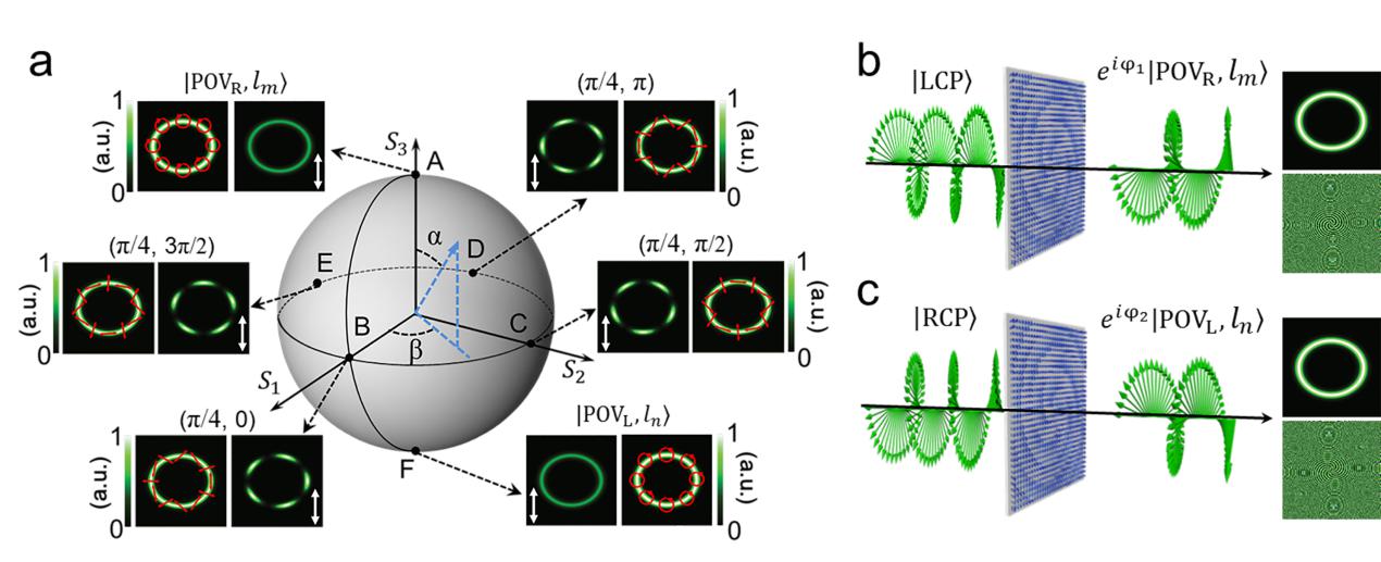近日,betway88西汉姆联徐挺教授与陆延青教授团队基于自旋复用超构表面光学器件,可以相继实现不同拓扑荷数的完美涡旋光束和不同状态的完美庞加莱光束的宽带产生,并首次将完美庞加莱光束应用于光学信息的编码与加密。光是一种电磁波,可以同时具有自旋角动量(Spin Angular Momentum, SAM)和轨道角动量(Orbital Angular Momentum,OAM)。自旋角动量与光的圆偏振态的手性相关,而轨道角动量与光的空间相位分布相关。庞加莱光束是一种矢量涡旋光束,具有不同的空间偏振与相位分布。庞加莱光束可以由两个具有不同拓扑荷数的正交圆偏振涡旋光束叠加得到,其在光通信、显微成像、粒子操控、量子信息等领域有着广泛的研究与应用。然而,传统涡旋光束的直径大小与拓扑荷数的大小相关,所以,当不同涡旋光束的拓扑荷数相差很大时,多个光束在同向传播过程中,其叠加的光场强度容易发生坍塌,很难产生稳定的和高质量的庞加莱光束。近年来,为了克服上述局限性,完美涡旋光束的概念被提出,其光束直径大小与拓扑荷数大小基本无关。但是,传统完美庞加莱光束通常由多个光学元件(如螺旋相位片、轴棱镜、q-plates、空间光调制器或光学透镜等)级联产生,其光路复杂,体积庞大,不易于光学系统的集成化与小型化;并且光学元件之间的对准误差会产生像差。