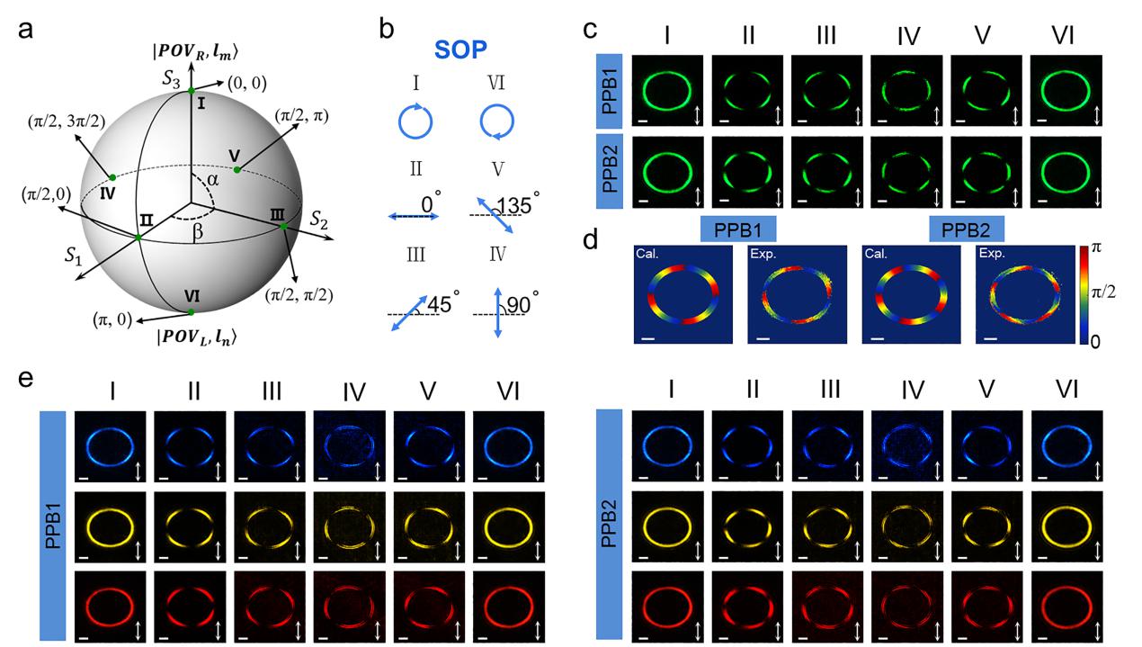 光学超构表面是一种由亚波长结构单元按照特定功能需要排列形成的一种超薄二维平面光学器件,可以任意地调控光的振幅、偏振、相位以及光谱等特性,其在光学成像、全息显示、空间结构光束、非线性光学、量子光学等领域有着广泛的研究。之前有工作基于硅基超构表面的振幅与相位联合调制,实现了矢量涡旋光束的产生,但其需要斜入射,并且产生效率和带宽较为受限。在本研究工作中,研究者基于自旋复用的全介质超构表面,在可见光频段内,实现了广义的完美庞加莱光束的宽带低损产生,其光束形状可为任意的圆形或椭圆形。基于纯相位调制的原理,所设计的二氧化钛型超构表面,对于一对正交圆偏振光,可以提供两种不同的相位分布并集成多种传统光学元件的功能,能够直接产生混合阶庞加莱球上对应的任意状态的完美庞加莱光束(图1)。首先,在实验中使用不同波长的光入射时,所制造的超构表面光学器件可以产生两种具有不同拓扑荷数的正交圆偏振涡旋光束。所产生的涡旋光束直径大小与其携带的拓扑荷数大小基本无关。其次,通过入射不同的偏振光,同一个超构表面光学器件可以产生不同状态的完美庞加莱光束(图2),其光束的大小、椭圆率与偏振级数、拓扑Pancharatnam 荷数基本无关。此外,作为原理验证示例,研究者在实验上将完美庞加莱光束应用于了光学信息的编码存储与加密。该研究工作为宽带产生完美庞加莱光束提供了低损耗、集成化与紧凑化的平台,有利于推动超构表面光学器件在光学信息编码加密、光学存储、矢量全息、偏振光学、量子光学等领域的应用。