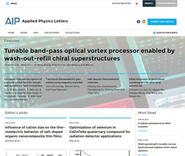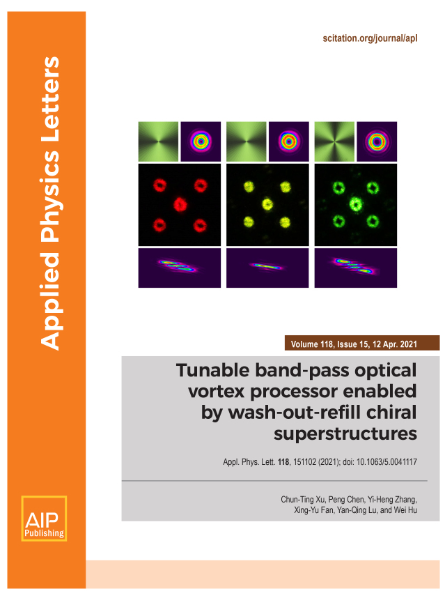 相关成果以Tunable band-pass optical vortex processor enabled by wash-out-refill chiral superstructures为题,发表在2021年15期《应用物理快报》上,并被选作当期精选论文/Featured article和封面论文。该研究得到了陆延青教授的精心指导,betway88西汉姆联为唯一单位。论文第一作者是18级直博生徐春庭,陈鹏副教授、胡伟教授为共同通讯作者,张逸恒、范星宇对本文亦有重要贡献。该研究由自然科学基金、江苏省基金、betway88西汉姆联卓越研究计划等项目资助完成,同时感谢固体微结构物理国家重点实验室、智能光传感与调控技术教育部重点实验室等平台的大力支持。