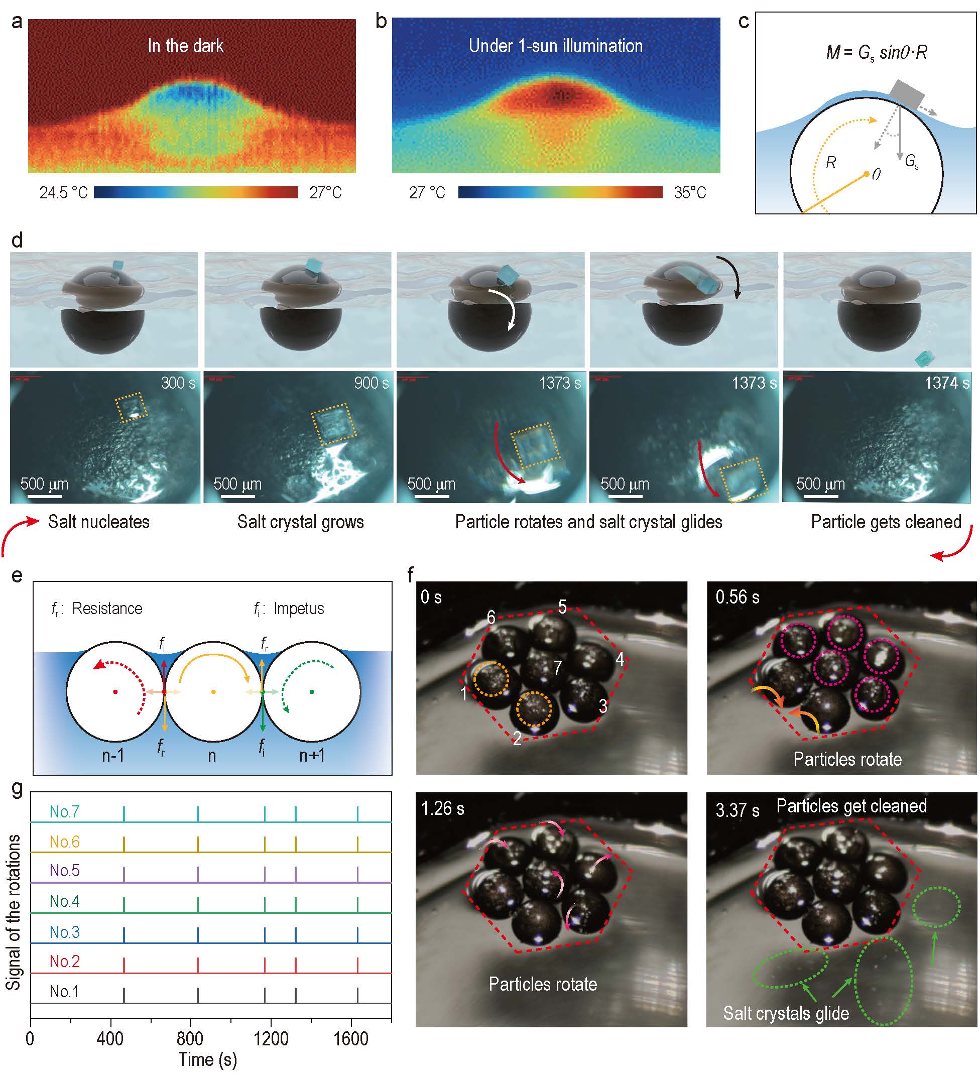 图3. 光热小球的自发转动和自清洁过程。a和b,光热小球在太阳光和暗场下的红外照片,显示出小球上端液面蒸发较快。c,光热小球自旋转的原理分析图。d,单个小球的自发旋转和自清洁过程。e,多球联动转动过程的力学分析图。f,多球系统自发联动转动和自清洁的照片。g,多球系统的转动行为统计图。