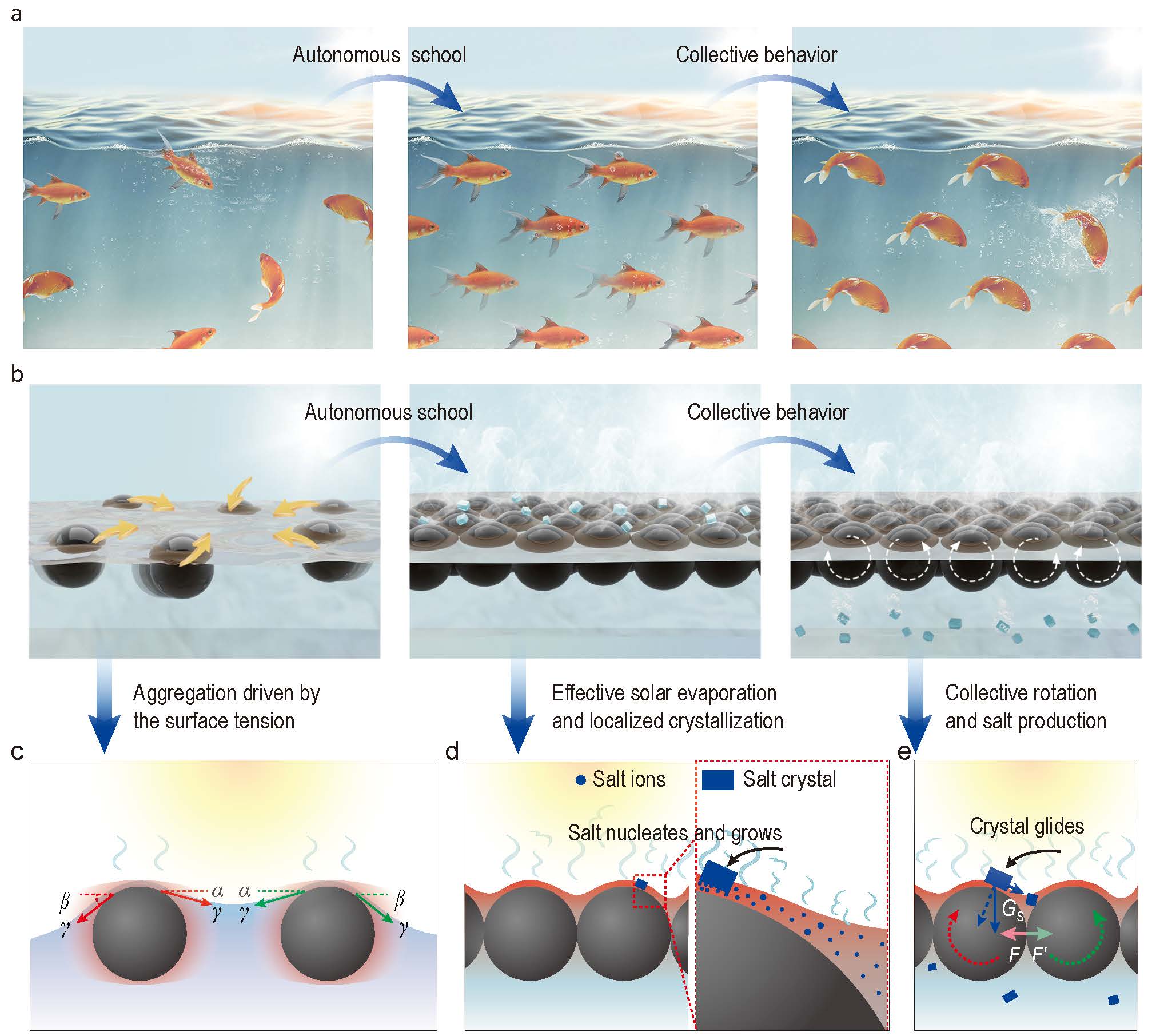 图1. 受鱼群效应启发的自聚集、自清洁的太阳能水盐分离器件。a,鱼类趋向于聚集成群,且鱼群行为通常一致化。b和c,EPS/GO光热小球在水面上可自聚集成热局域的动态系统, 且在太阳能水处理过程中可实现联动的自发旋转和自清洁过程。