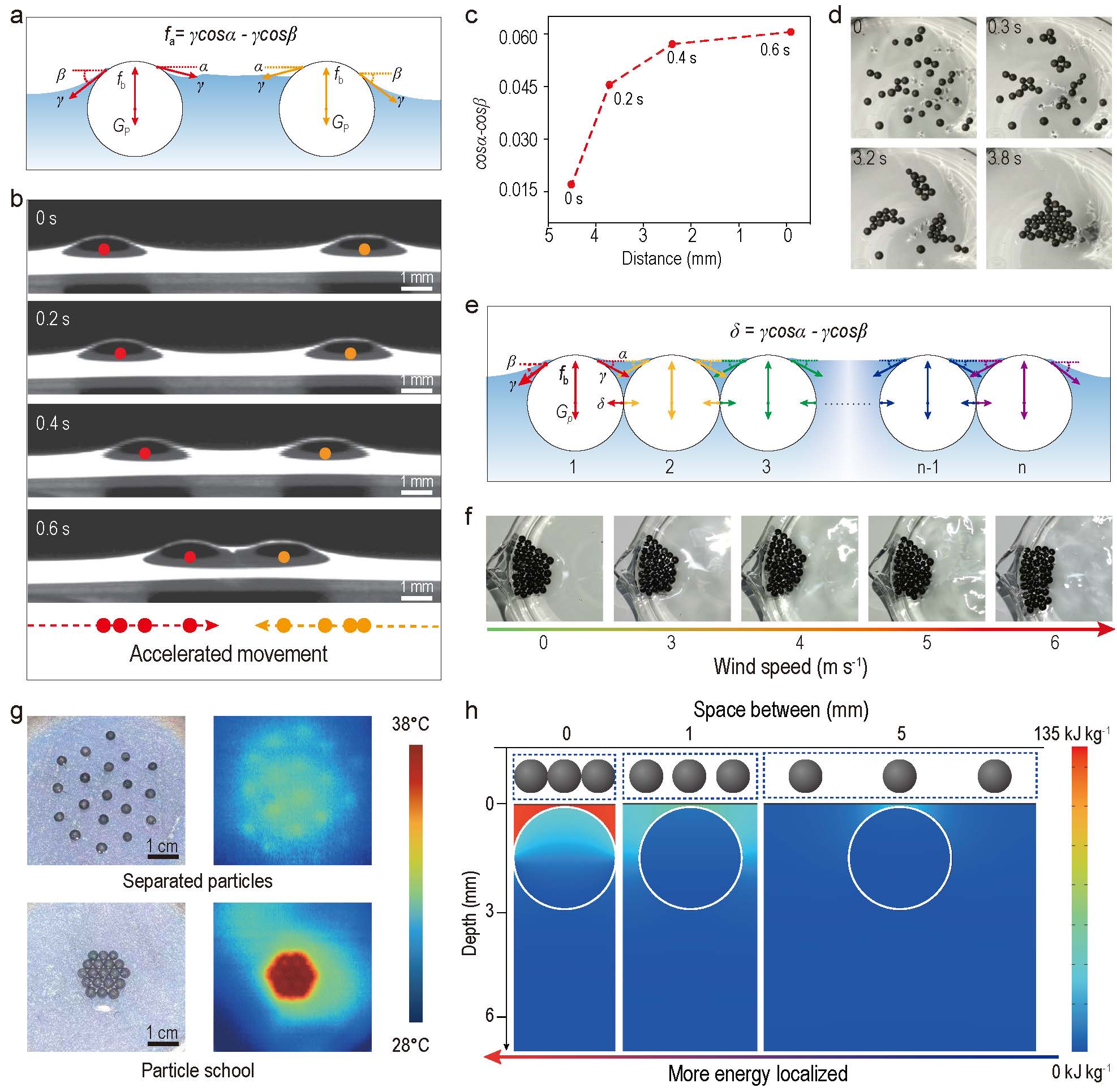 图2. 光热小球在表面张力作用下的自聚集过程,及其热局域特性。a,光热小球在水面加速靠近的原理分析图。b-d,小球的加速自聚集过程。e和f,自聚集的光热小球在表面张力下可形成有相互作用力的整体。g和h,自聚集的光热小球系统具有更好的热局域特性。
