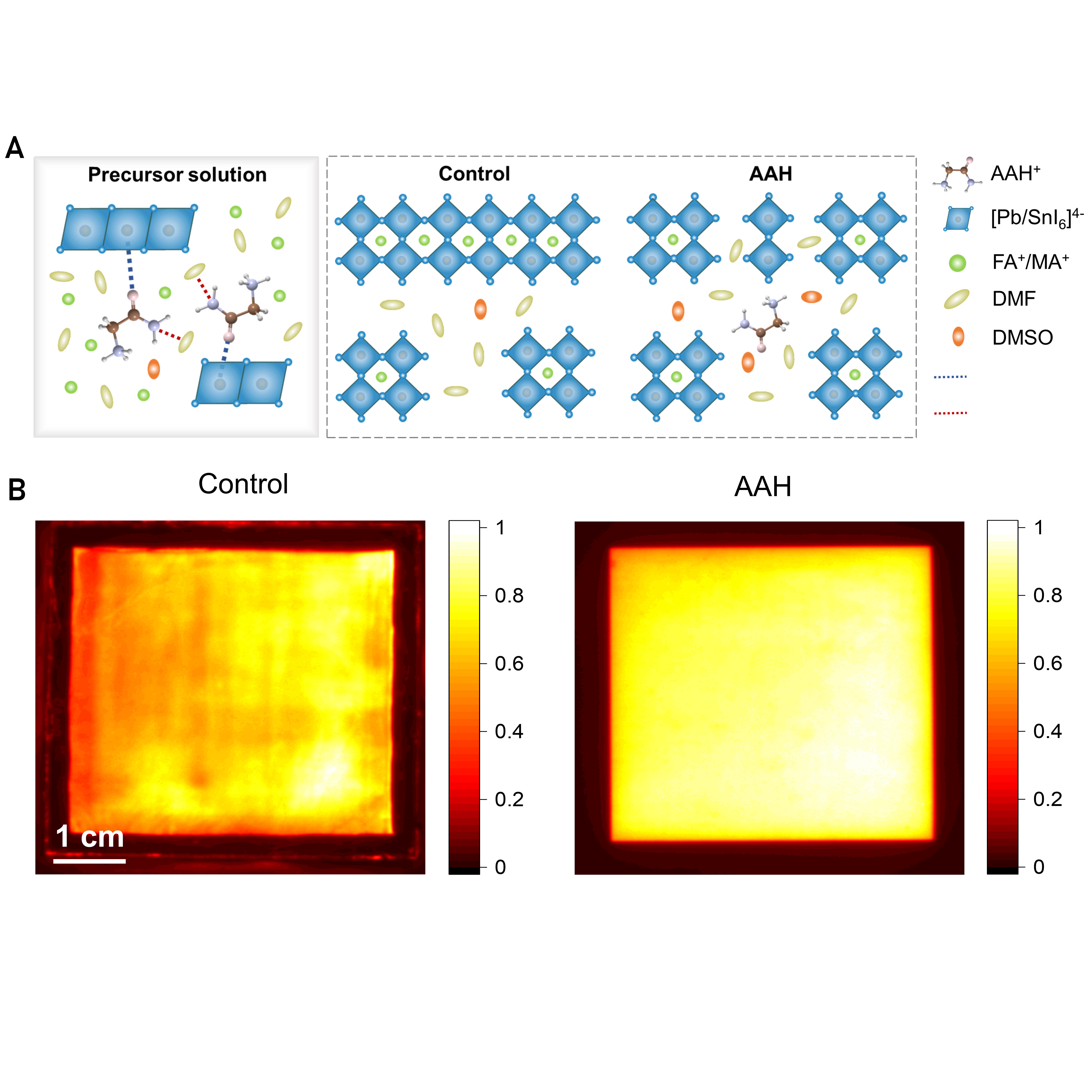图1. 大面积窄带隙钙钛矿薄膜的均匀制备。(A)甘氨酰胺盐酸盐与钙钛矿的相互作用示意图;(B)甘氨酰胺盐酸盐对钙钛矿薄膜均匀性的提升。