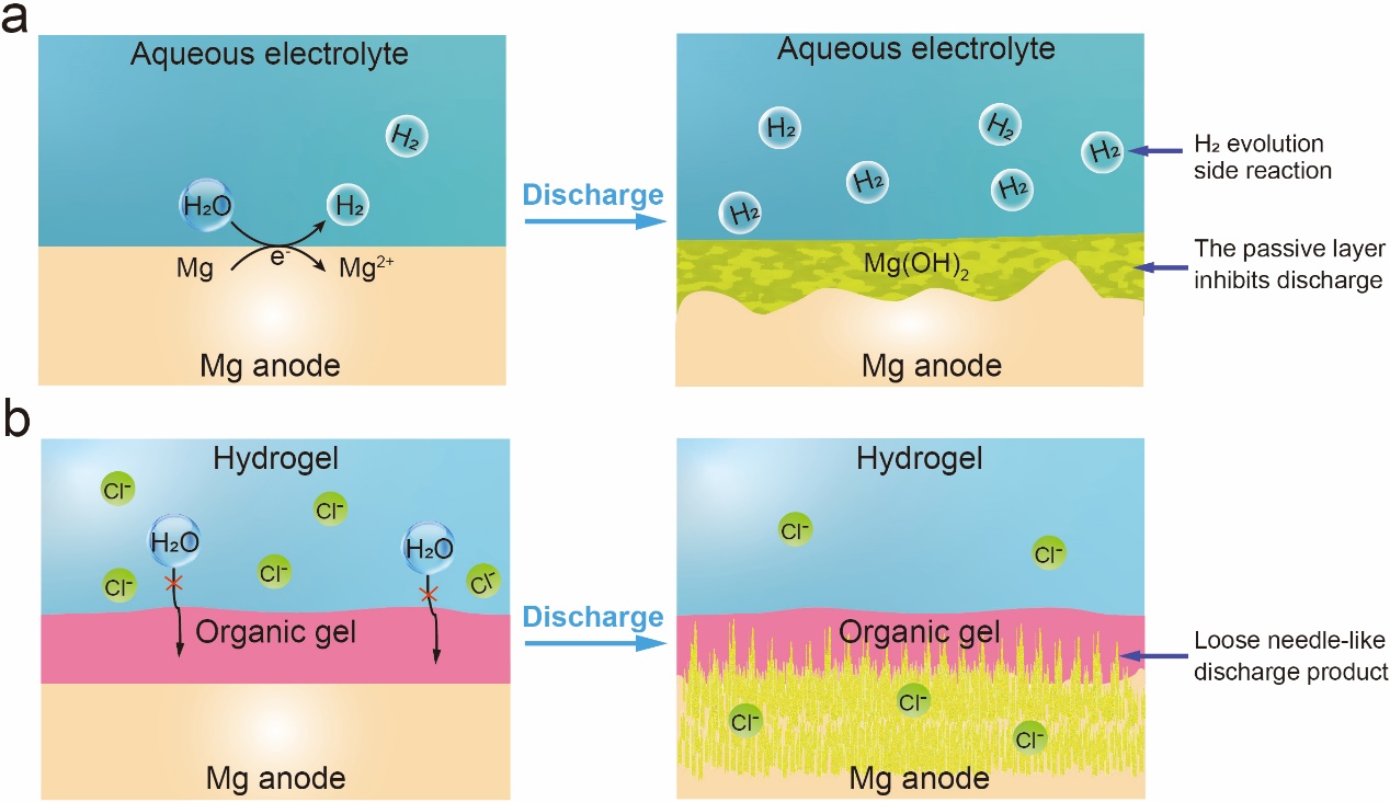 图1镁空气电池在(a)常规液态电解质和(b)双层凝胶电解质中的放电示意图。