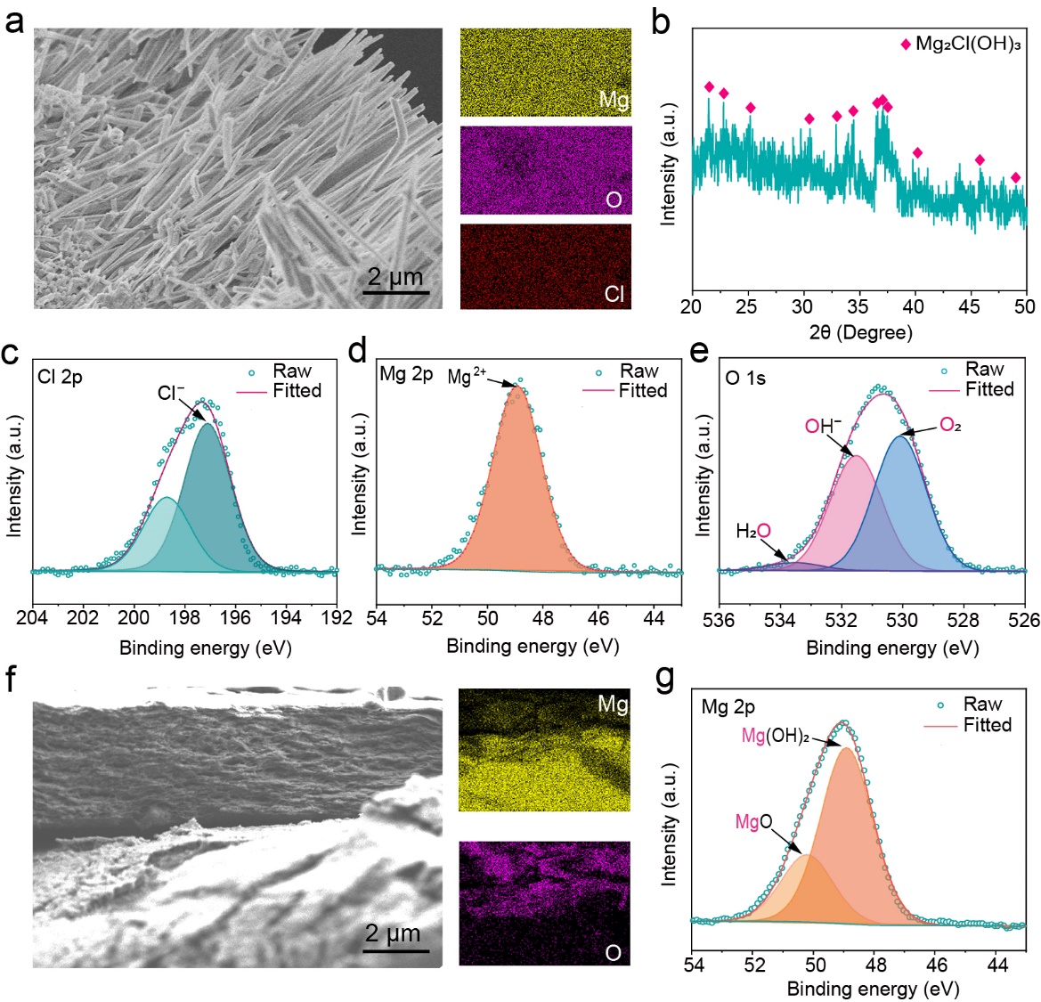 图3放电产物分析。(a-e)使用含氯金属盐的双层凝胶电解质的镁空气电池产物为针状形貌的Mg2Cl(OH)3。(f-g)使用不含氯金属盐的双层凝胶电解质的镁空气电池产物为致密的氢氧化镁。