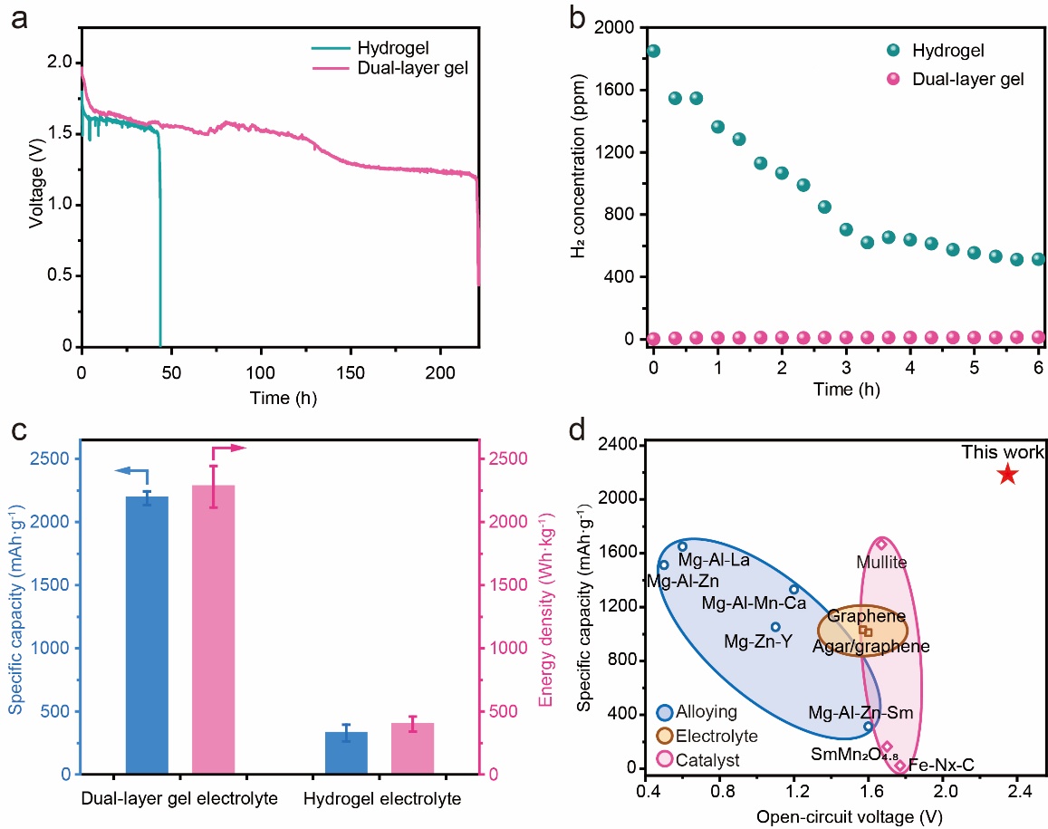 张晔课题组等设计了一种双层凝胶电解质,实现了对镁金属负极的保护以及对放电产物的调控,获得了具有高能量密度的镁空气电池(2282 W h·kg-1,基于全部空气电极和镁负极的质量),远高于目前文献中采用合金化负极和抗腐蚀电解液等策略的镁空气电池。