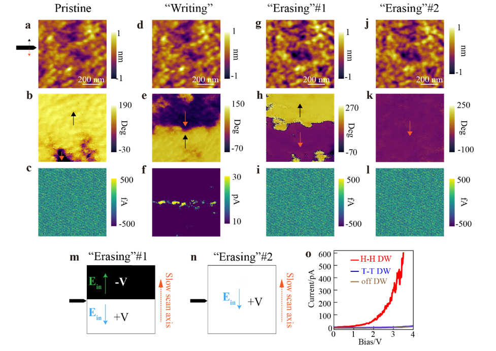 图2.BaTiO3/Si中铁电畴壁导电性的可擦写调控。(a-c) 读取样品本征状态。(d-f)“写入”导电畴壁。(g-n) 两种不同的方式“擦除”导电畴壁。(o) 不同畴壁状态下的电流-电压曲线。