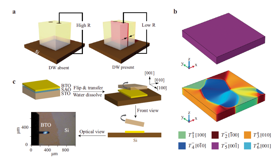 图1. 铁电畴壁存储器原型和制备流程示意图。(a) 铁电畴壁存储器的OFF和ON状态。(b) BTO薄膜转移前后的畴结构相场模拟。(c) 自支撑铁电薄膜与硅基片集成的流程示意图。
