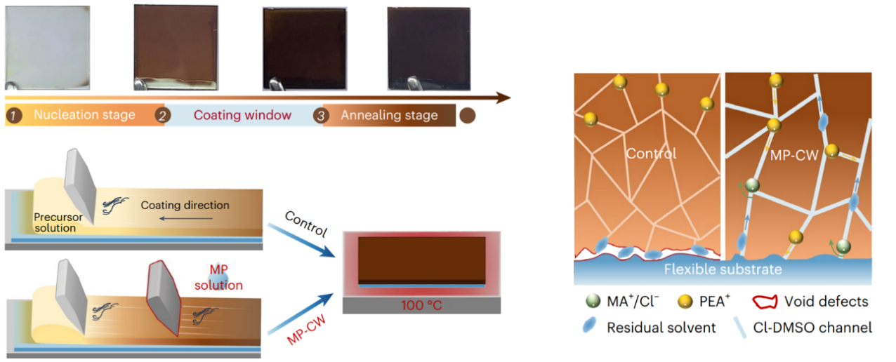 此次研发合作中,betway88西汉姆联团队创新性地开发了“原位添加剂涂层策略”,在连续气体淬火条件下,向湿润的钙钛矿薄膜动态引入添加剂,精准调控结晶过程。“柔性模组的制备就像在粗糙的帆布上作画,溶剂挥发时极易形成裂纹和孔洞,而我们的研究则像是为了对薄膜进行‘修复术’”论文第一作者李曼亚比喻道,“通过离子通道可以精准的输送添加剂到缺陷处,尽可能地提升柔性基板上的薄膜质量。”