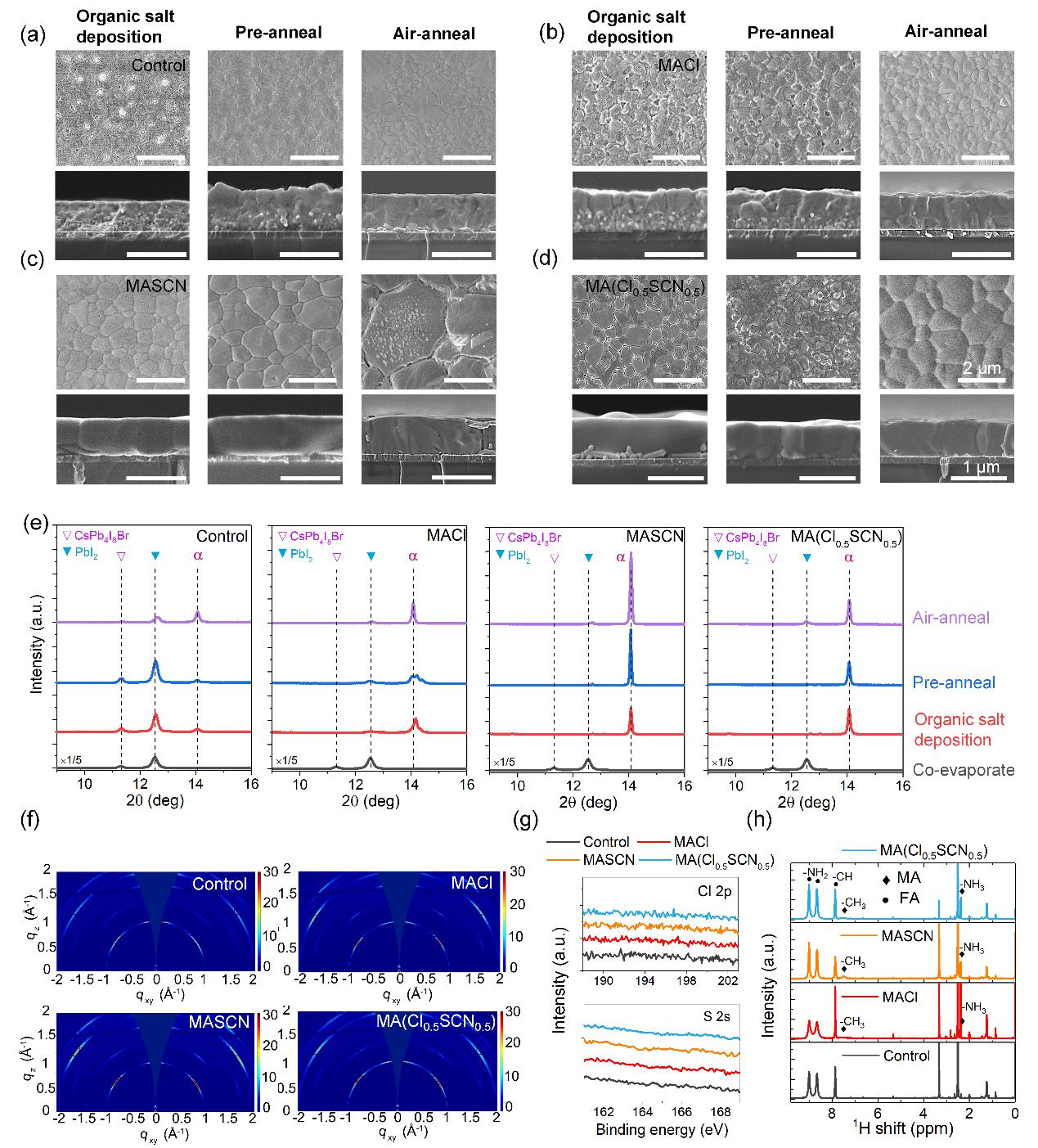 Figure 2. Characterization of perovskite films with different additives. a, b, c, d) Top-view (up), and cross-sectional (down) SEM images showing the conditions of perovskite films after different processes. e) X-ray diffraction (XRD) patterns of perovskite films after different process, including inorganic framework after co-evaporation (black line), organic salt deposition (red line), pre-annealing (blue line), and air-annealing (purple line). The symbol α represents α-phase perovskite. f) GIWAXS patterns of perovskite films with various additives. g) Cl 2p and S 2s XPS spectra of perovskite films. h) 1H NMR spectra of powders scratched from the perovskite films with various additives.