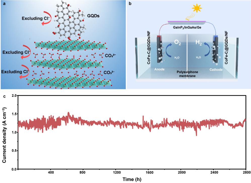 Figure 1. a, CoFe-LDHs for CO32− intercalation and surface modification with GQDs (CoFe-Ci@GQDs). b, Stability test of CoFe-Ci@GQDs/NF in alkaline simulated seawater (1 M KOH + 0.5 M NaCl). c, Schematic diagram of a photovoltaic seawater electrolysis device based on CoFe-Ci@GQDs/NF.