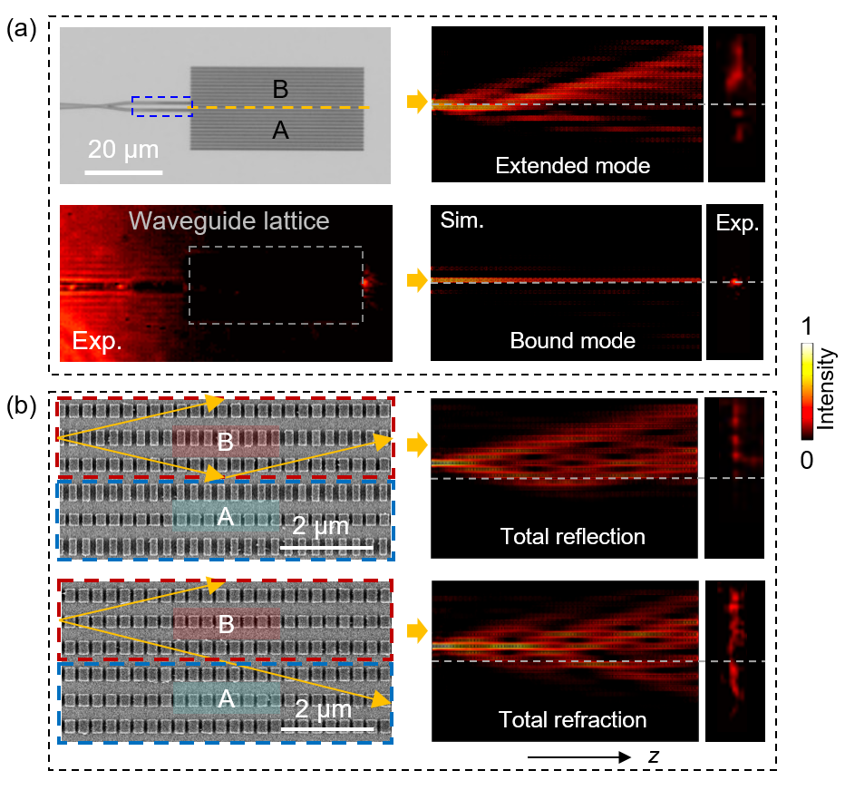 The tilted dispersion of Type-II Weyl band structures also provides a new means to control light refraction and reflection at interfaces. For example, by choosing the rotational phase to cause complete mismatch of the bandgaps of the two Type-II Weyl media, a total reflection effect occurs at the interface, which has potential applications in light guiding functions based on Weyl materials. Additionally, in Type-II media, various phase choices can achieve partial reflection and full transmission phenomena, while Type-I Weyl media always maintain full transmission characteristics. All of these effects have been experimentally verified in on-chip silicon waveguides in the communication band (Fig. 3).