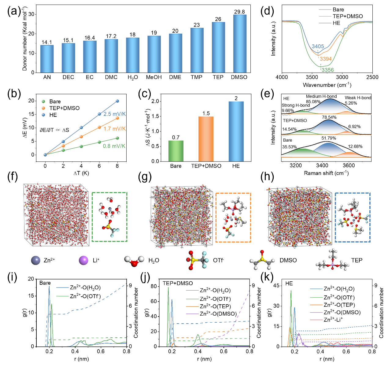 Figure 2.(a) Donor numbers of various common solvents. Entropy changes in different electrolyte systems, derived based on (b) experiment and (c) theoretical calculations. (d) FTIR and (e) Raman spectra of O-H stretching vibrations in different electrolytes. 3D snapshot of (f) bare, (g) TEP+DMSO, and (h) HE electrolytes and the corresponding solvation structure of Zn2+ obtained from MD simulations. Radial distribution functions and coordination number distribution functions obtained from MD simulations of (i) bare, (j) TEP+DMSO, and (k) HE electrolytes.