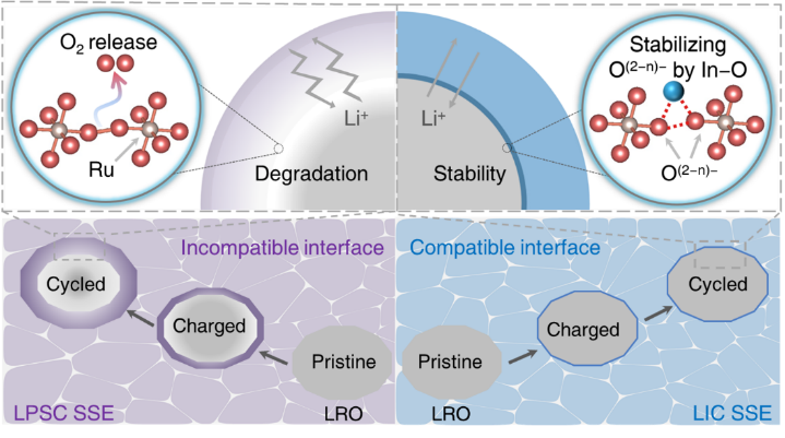Figure. Schematic illustration of the highly reactive oxidized oxygen (O(2−n)−) evolution of LRO at the interface of two classical SSEs, LPSC and LIC, with LRO in ASSLBs and the self-constructed lattice-oxygen-stabilized interface between LIC and LRO.
