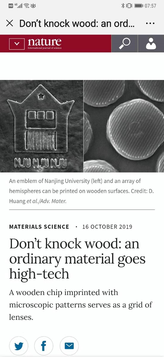 Nature Highlights the progress inDon’t knock wood: an ordinary material goes high-tech(https://www.nature.com/articles/d41586-019-03138-7):Mingwei Zhu at Nanjing University in China, Liangbing Hu at the University of Maryland in College Park and their colleagues have applied the technique to cellulose in wood fibre, which can serve as an abundant substitute for plastic.