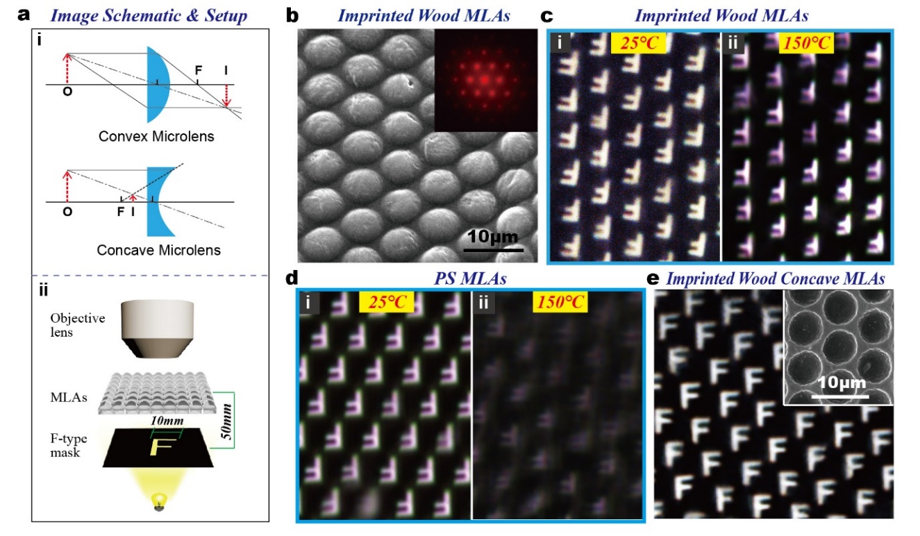 Figure 3 Application demonstration of the imprinted wood as an MLA. a) Schematic of the optical imaging setup using the MLA and its characterization with a microscope, in which the image effect is demonstrated using the character “F” as the objective. b) SEM image of the convex wood MLA with unit lens size of ≈6.5 µm in diameter. The inset is the light scattered dot pattern. Their periodic arrangement indicates the periodicity of the MLA over a large area. c) The image effect of the wood MLA, in which the clear images of the letter “F” with sharp edges are clearly observed. d) In contrast, the PS MLA does not show a clear image at 150 °C. e) The concave wood MLA also exhibits good image effect.