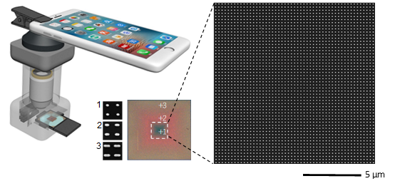 Figure 1 Optical and electron micrographs of gradient pattern plasmon sensors and schematic diagrams of mobile phone reading devices.