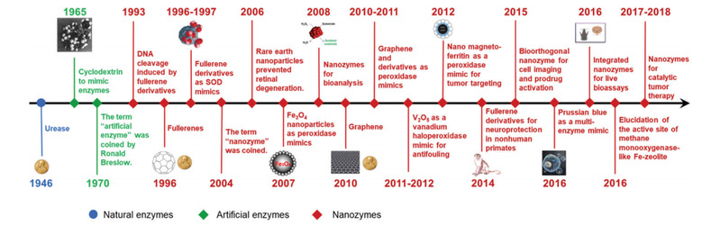 Figure 1 A brief timeline for the development of nanozymes (natural enzymes and artificial enzymes are listed for comparison)