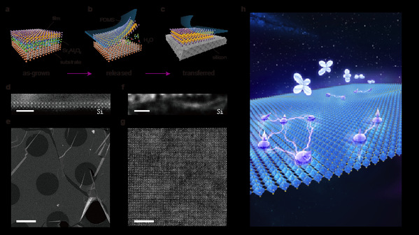 (a-c) Schematic diagram of preparation and transfer of two-dimensional oxide perovskite thin films; (d-g) Characterization of subatomic resolution structures with different crystal orientations; (h) Prospect of rich and strongly correlated two-dimensional quantum states in two-dimensional oxide perovskite materials