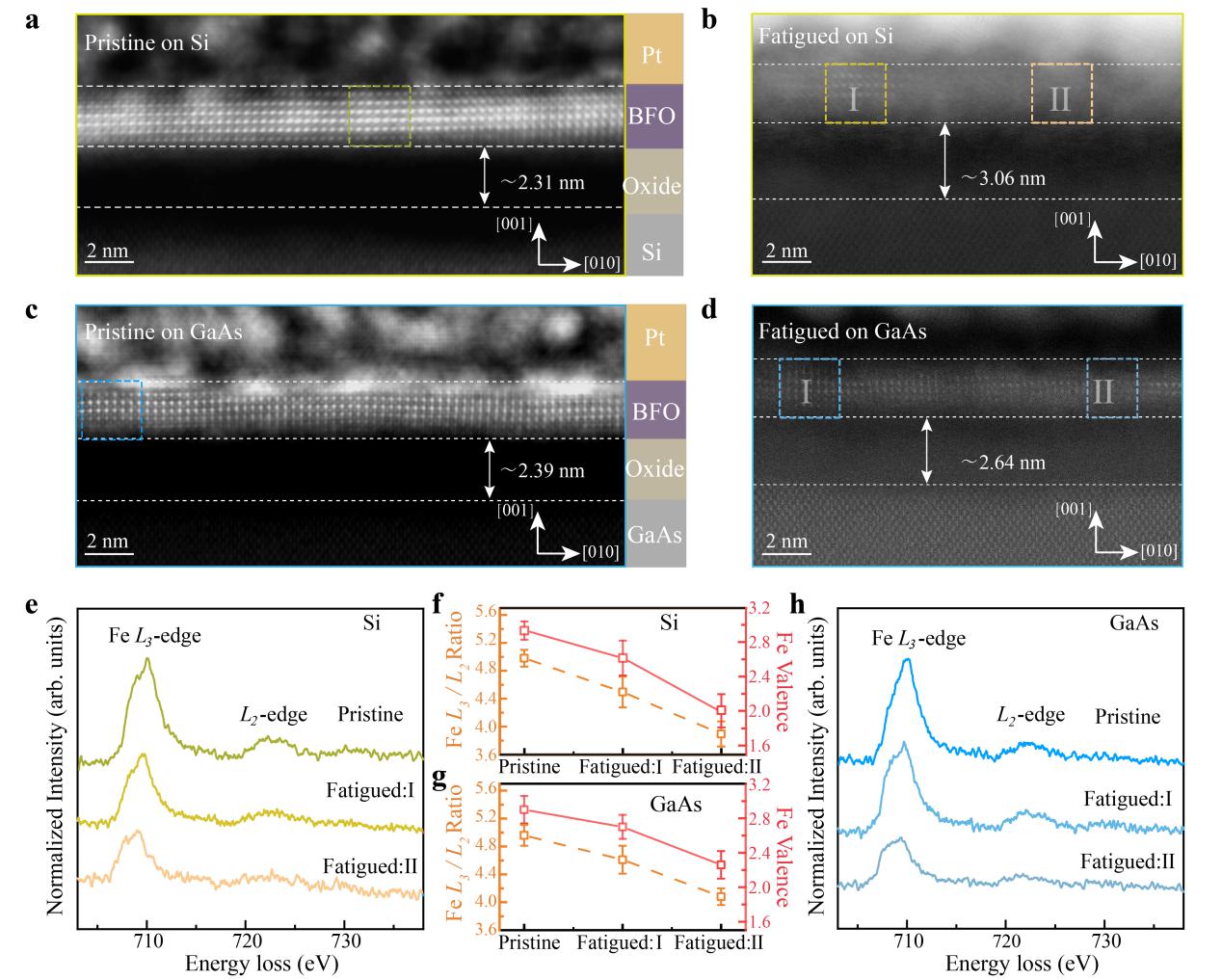 Through high-resolution electron microscopy, the research team elucidated the atomic-scale fatigue mechanism in oxide/semiconductor FTJs, as illustrated in Figure 2. A comparative analysis of before and after fatigue structures revealed that fatigue originates from the oxygen vacancies accumulation within the BFO layer, which triggers progressive lattice collapse and consequent reduction in effective ferroelectric polarization. This structural collapse initiates at the semiconductor interface and propagates toward the top electrode. Electron energy loss spectroscopy (EELS) further demonstrated that lattice degradation coincides with the reduction of Fe valence states and increased oxygen vacancies generation. By comparing different semiconductor substrates, the fatigue behavior exhibited strong substrate dependence, with GaAs-based FTJs showing superior fatigue resistance. This phenomenon is attributed to the semiconductor's oxygen affinity: the weaker bonding interaction between oxygen and gallium/arsenic effectively suppresses oxygen vacancies formation and accumulation in BFO, thereby mitigating lattice damage.