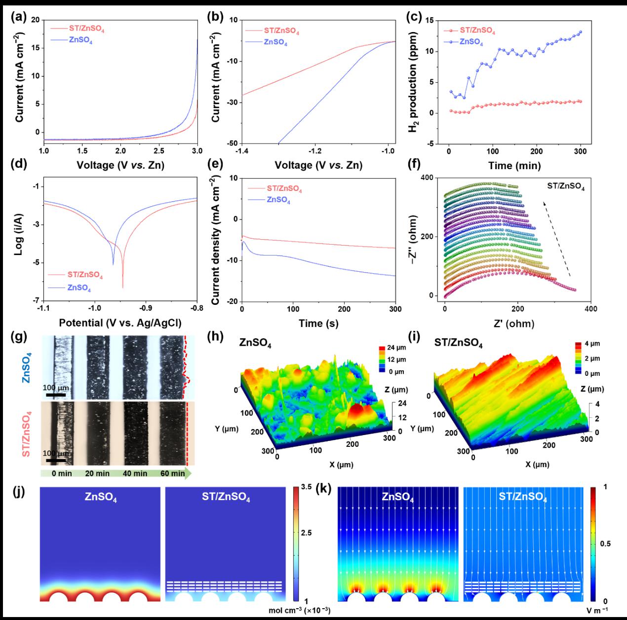 Figure 2 illustrates the functional mechanism of ST molecules in the electrolyte. The introduction of ST molecules optimizes the solvation structure of the electrolyte, effectively suppressing zinc corrosion and the hydrogen evolution side reaction.