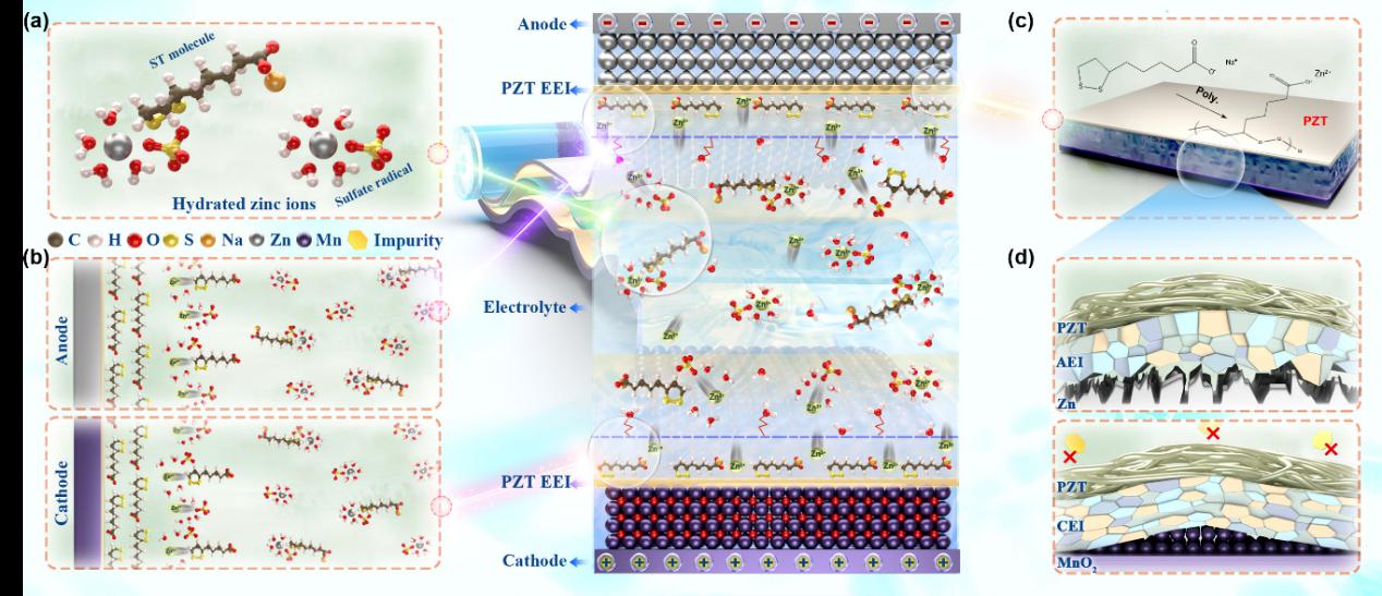 Recently,professor Yagang Yao’s Group at Nanjing universityintroduces a simple and scalable engineering strategy to establish a stable bilayer interface between electrodes and electrolytes by incorporating sodium thioctate (ST) molecules into ZnSO4 electrolytes. The introduction of zincophilic ST molecules first optimizes the electrolyte environment by modulating the solvation structure of hydrated Zn2+ ions, partially displacing associated H2O molecules from the solvation sheath, and thereby mitigating corrosion while suppressing HER. Subsequently, the specific adsorption of electronegative ST anions at the inner Helmholtz plane (IHP) reconstructs the EDL structure, simultaneously promoting the desolvation of hydrated Zn2+ ions and homogenizing charge distribution via Zn2+-capturing capability. Upon adsorption, the in-situ polymerization of interfacial ST molecules constructs a bilayer architecture comprising a ZnS–organic amorphous inner layer and a poly(zinc thioctate) (PZT) outer layer, where the former regulates Zn2+ ion flux while the latter enhances mechanical robustness. Remarkably, the dynamic cleavage and recombination of disulfide bonds in ST molecules endow the polymeric interface with self-healing properties, enabling damage repair and further enhancing the self-regulating and adaptive capabilities of the EEI. As a result of these unique features, ST-enhanced Zn symmetric cells achieve an ultralong cycle life of 7,800 cycles at a high current density of 60 mA cm−2. Furthermore, the assembled AZMBs demonstrate exceptional cycling stability, with a negligible capacity decay rate of 0.0014% over 10,000 cycles at 2,000 mA g−1. This bilayer interface engineering strategy represents a significant advance in accelerating the development of long-lifespan AZMBs.