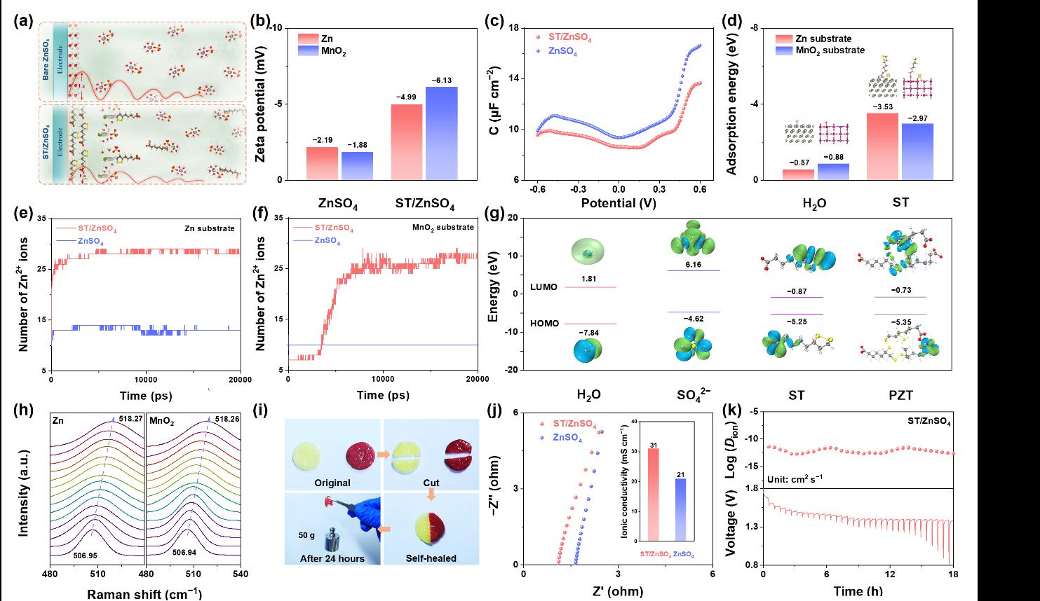 Figure 3 illustrates the formation mechanism of ST molecules at the EEI.The specific adsorption of electronegative ST anions at the inner Helmholtz plane (IHP) reconstructs the EDL structure, simultaneously promoting the desolvation of hydrated Zn2+ ions and homogenizing charge distribution via Zn2+-capturing capability. Upon adsorption, the in-situ polymerization of interfacial ST molecules constructs a bilayer architecture comprising a ZnS–organic amorphous inner layer and a poly(zinc thioctate) (PZT) outer layer, where the former regulates Zn2+ ion flux while the latter enhances mechanical robustness. Remarkably, the dynamic cleavage and recombination of disulfide bonds in ST molecules endow the polymeric interface with self-healing properties, enabling damage repair and further enhancing the self-regulating and adaptive capabilities of the EEI.