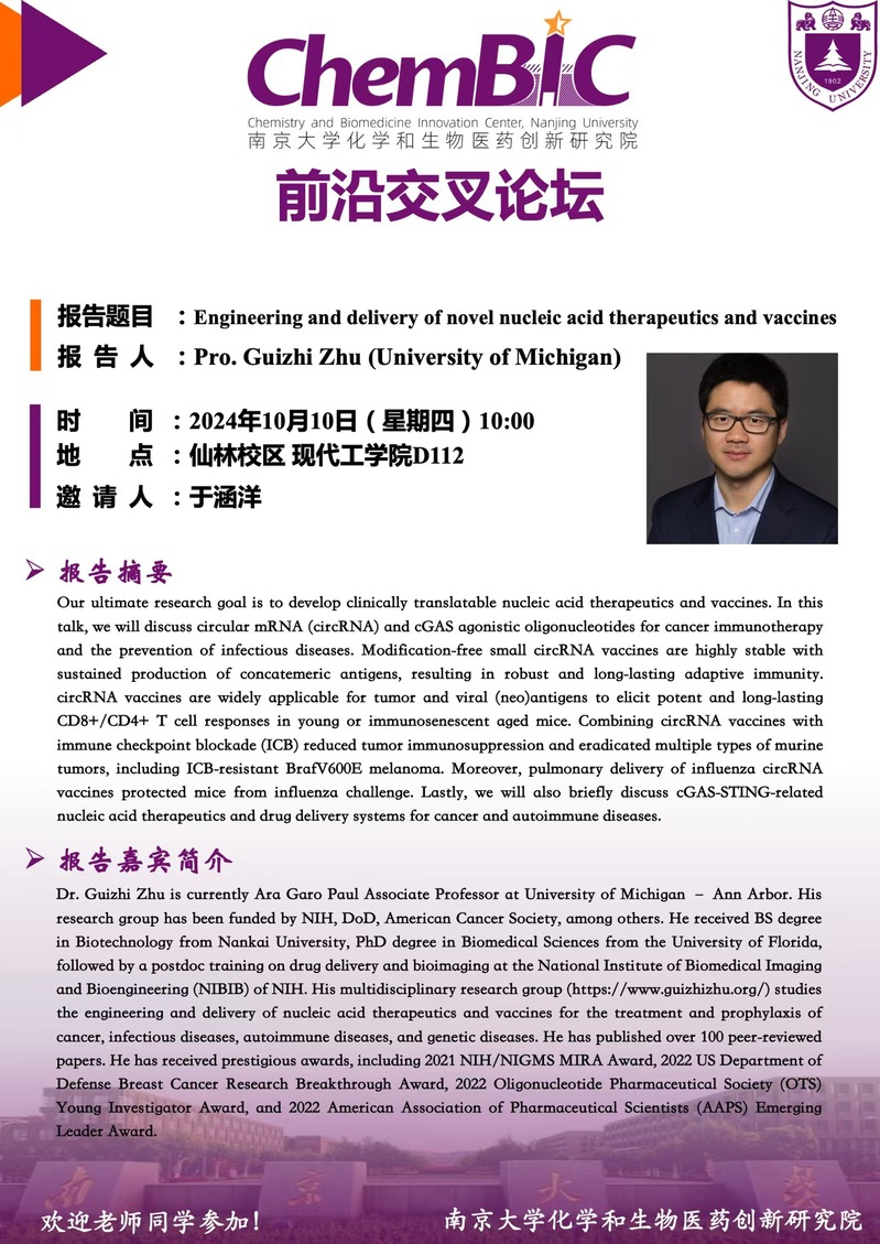 Pro. Guizhi Zhu (University of Michigan):Engineering and delivery of novel nucleic acid therapeutics and vaccines